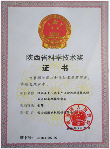 日前,全省科技创新大会暨科学技术奖励大会在西安隆重召开,省委书记胡和平出席会议并讲话,省长刘国中主持会议,会议表彰了2018年度省科学技术奖获奖项目,并向最高成就奖及一等奖获奖者颁发了奖励证书。pa旗舰厅官网和西北农林科技大学合作研发的“陕西小麦玉米生产保护性耕作技术模式与配套机械化装备”项目成果荣获省科技进步一等奖。